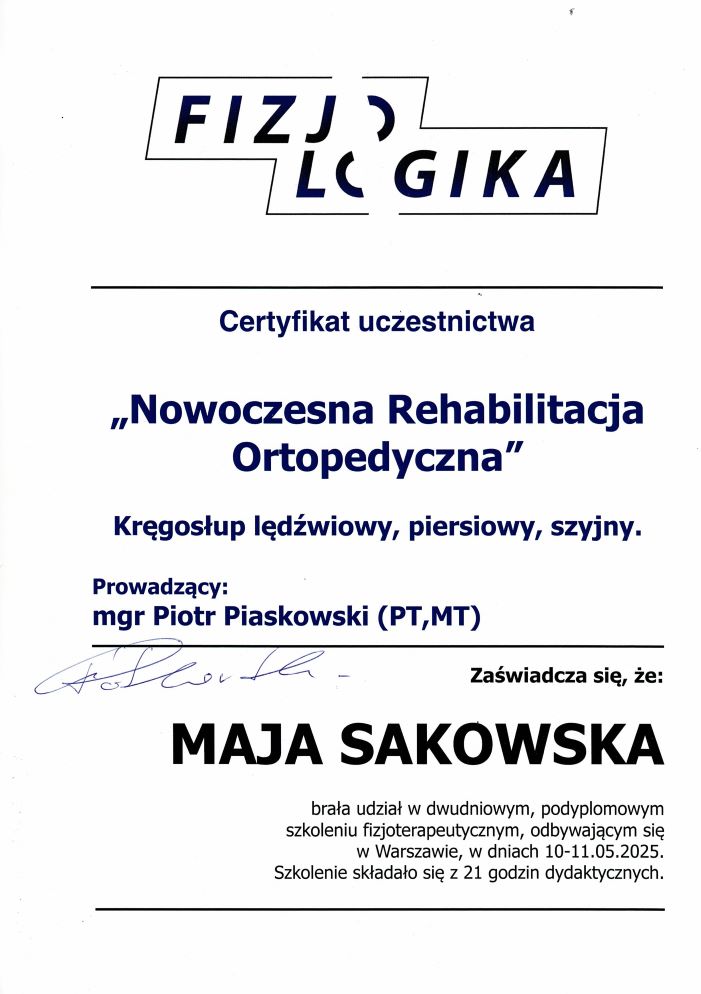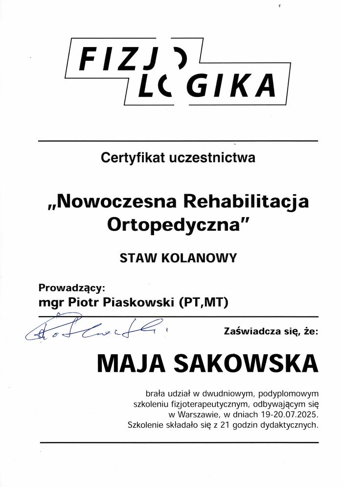 - szkolenie: „Fizjokorki – cykl 10 szkoleń specjalistycznych (Katowice, 18.12.2024 – 18.06.2025, łącznie 50h dydaktycznych) obejmujący m.in. badanie miednicy, kręgosłupa L-S, stawów: kolanowego, ramiennego i skokowego, ocenę postawy ciała, wnioskowanie kliniczne, podstawy neurodynamiki, czytanie badań obrazowych (MRI, TK), centralną stabilizację tułowia, neurofizjologię napięcia mięśniowego oraz zastosowanie USG w fizjoterapii. – Szkoła Diagnostyki Fizjoterapeutycznej FIZJO EKSPERT Centrum Fizjoterapii Sportowej i Ortopedycznej REHABILITA