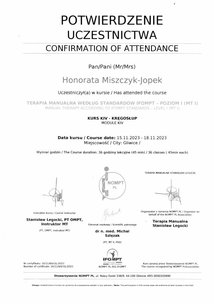 - terapia manualna wg standardu IFOMT MT II- prowadzący PT, OMT Stanisław Legocki (Katowice, 05.2010) w trakcie;