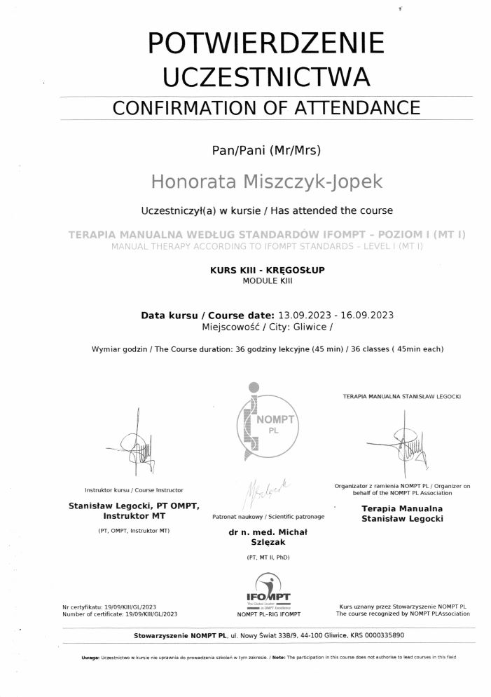 - kurs: „Terapia manualna wg standardów IFOMPT – poziom MT I – moduł KI”- prowadzący Stanisław Legocki (Kraków, 03-06.09.2025r.)