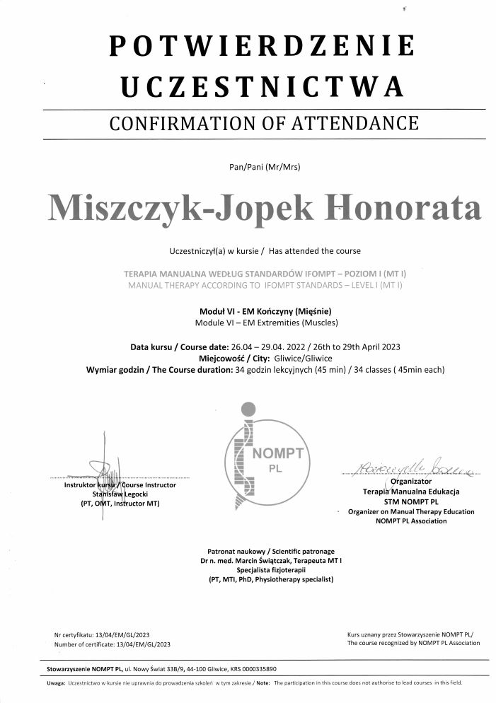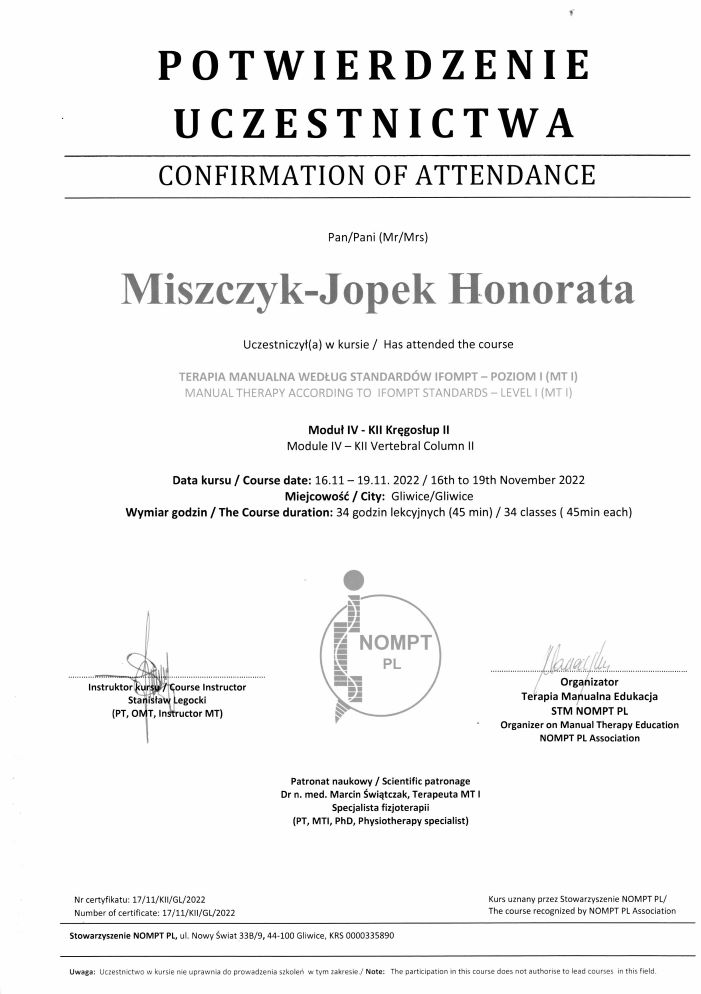 - ukończenie kursu IPNFA – Basic Course on Proprioceptive Neuromuscular Facilitation PNF (Kraków, 23-27.02.2011, 13-17.03.2011);