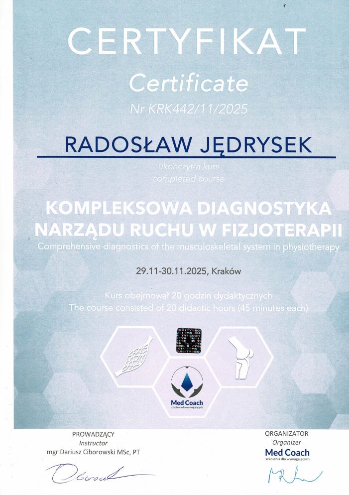 - kurs: „Kompleksowa diagnostyka narządu ruchu w fizjoterapii”- prowadzący Dariusz Ciborowski (Kraków, 29-30.11.2025r.)