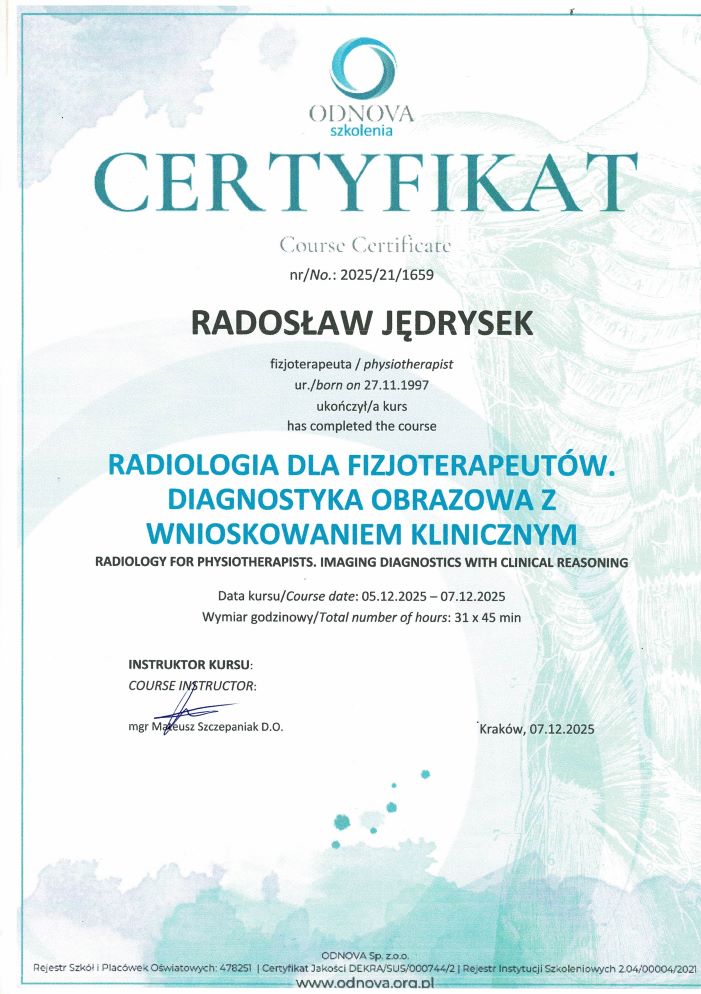 - kurs: „Radiologia dla fizjoterapeutów. Diagnostyka obrazowa z wnioskowaniem klinicznym”- prowadzący Mateusz Szczepaniak (Kraków, 05-07.12.2025r.)