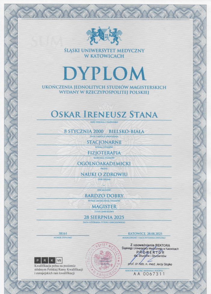 Absolwent fizjoterapii Śląskiego Uniwersytetu Medycznego w Katowicach,