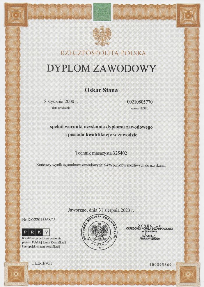 - masaż I stopnia z odnową biologiczną (Katowice, 19.10.2005-28.01.2006).