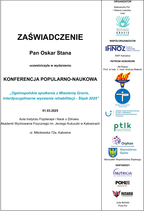 - Praktyki w Galen Rehabilitacja, opiekun praktyk: dr Filip Humpa (200h/45min);
