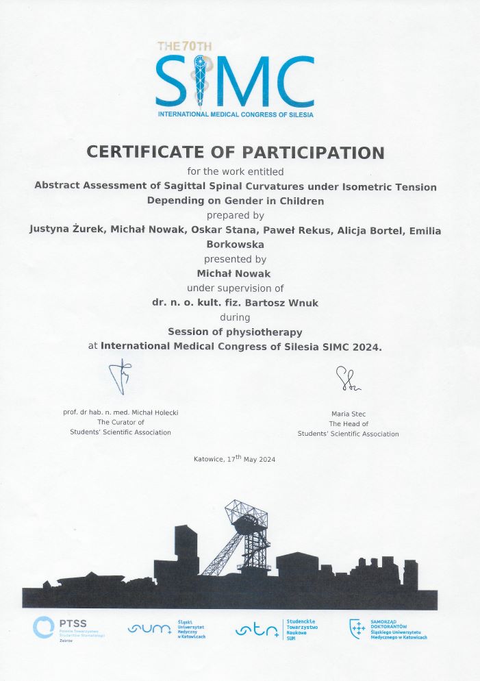 Kroczek, W., Kroczek, E., Żurek, J., Nowak, M., Stana, O., Rekus, P., Baranowska, E., & Wnuk, B. (2024). Ocena krzywizn kręgosłupa w płaszczyźnie strzałkowej w pozycji swobodnej oraz po wykonaniu testu Matthiasa u dzieci.