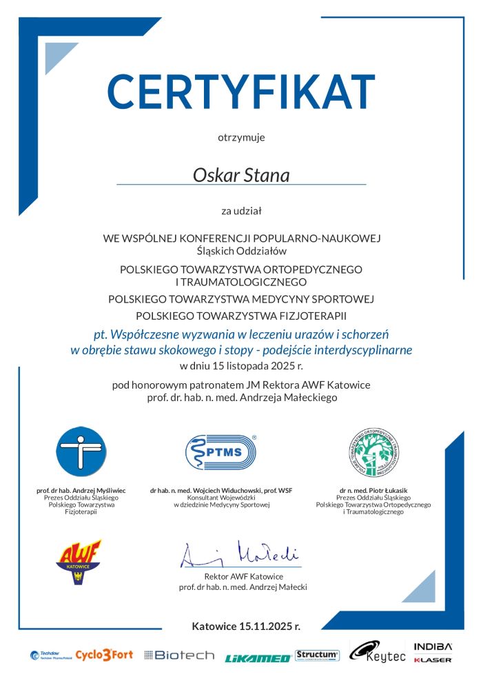 - szkolenie: „Powięź – badanie i leczenie na przykładzie skręconego stawu skokowego Katowice, 09.12.2023r. – Śląski Uniwersytet Medyczny w Katowicach