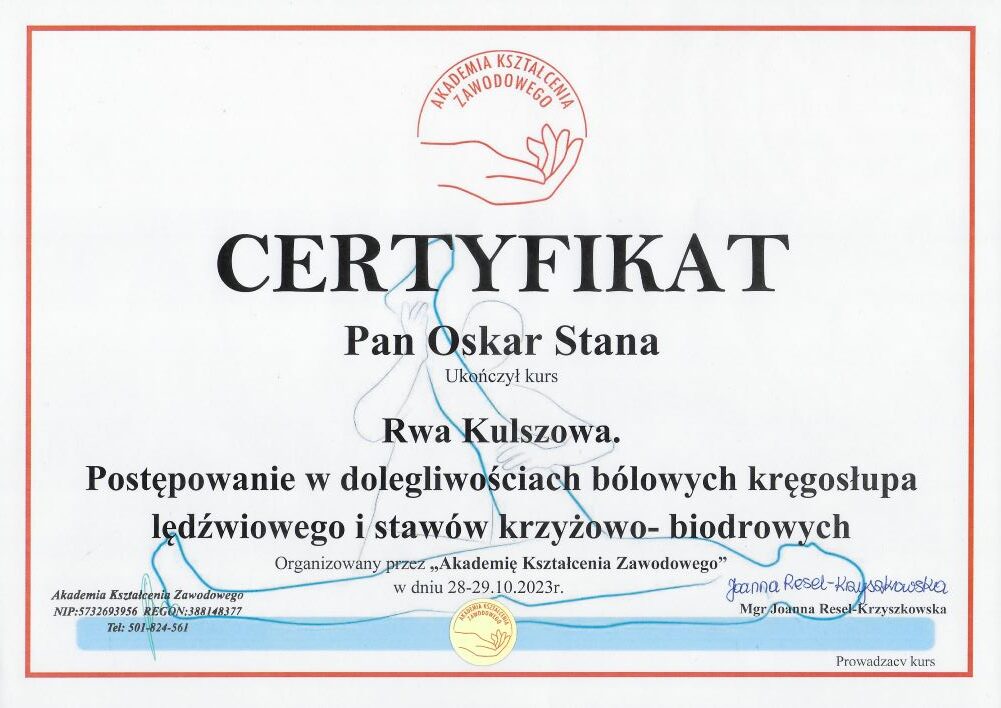 - szkolenie: „Rwa Kulszowa – Postępowanie w dolegliwościach bólowych kręgosłupa lędźwiowego i stawów krzyżowo-biodrowych Katowice, 28-29.10.2023r. – Akademia Kształcenia Zawodowego