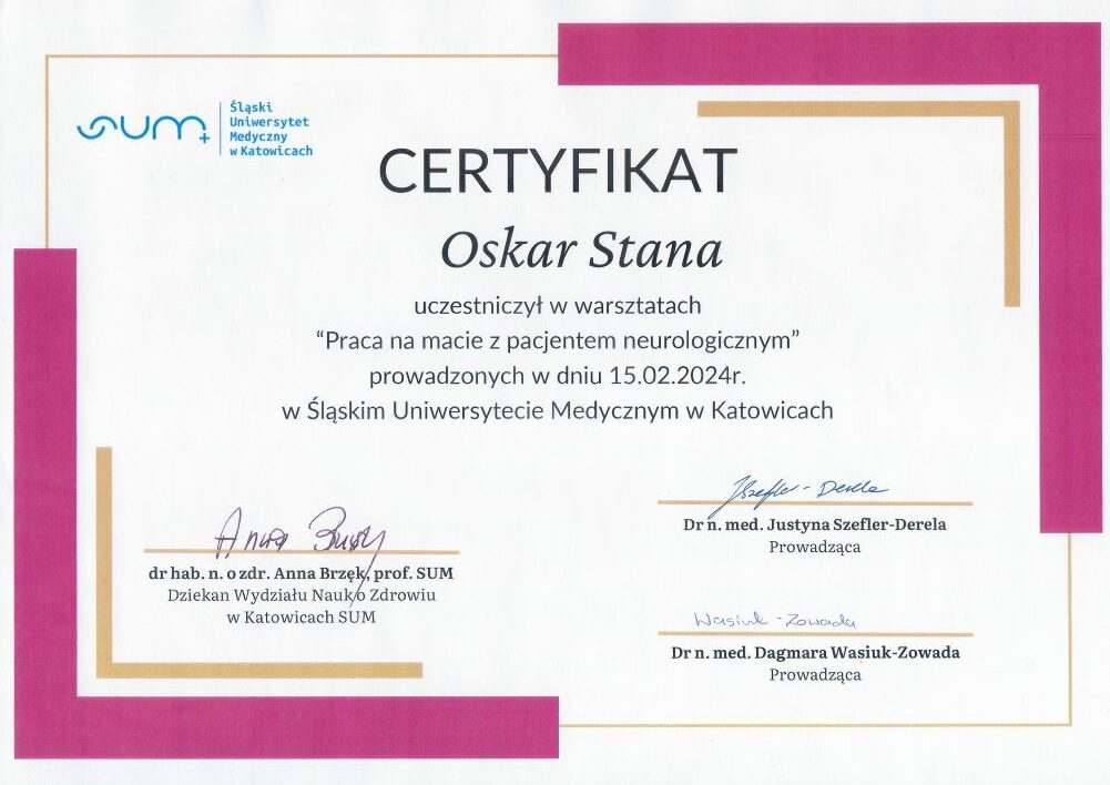 - szkolenie: „Praca na macie z pacjentem neurologicznym Katowice, 15.02.2024r. – Śląski Uniwersytet Medyczny w Katowicach