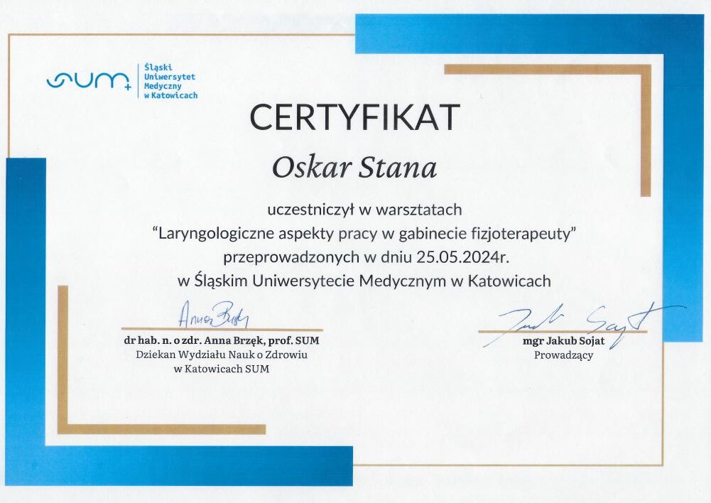 - szkolenie: „Laryngologiczne aspekty pracy w gabinecie fizjoterapeuty Katowice, 25.05.2024r. – Śląski Uniwersytet Medyczny w Katowicach