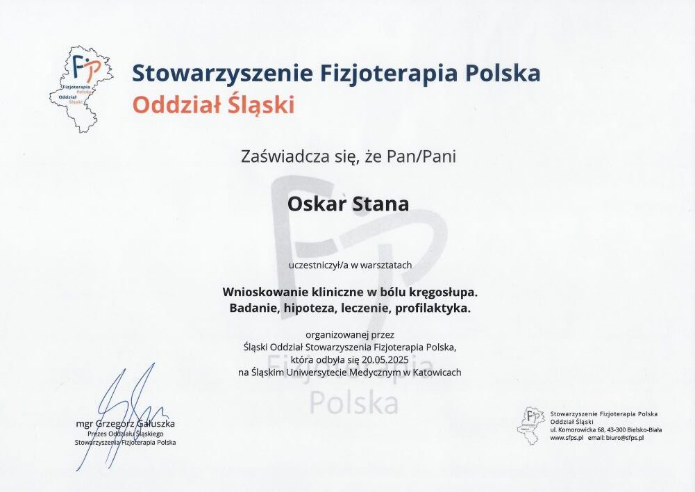 - szkolenie: „Wnioskowanie kliniczne w bólu kręgosłupa. Badanie, hipoteza, leczenie, profilaktyka. Katowice, 20.05.2025r. – Śląski Uniwersytet Medyczny w Katowicach, Śląski Oddział Stowarzyszenia Fizjoterapia Polska, prowadzący: mgr Grzegorz Gałuszka
