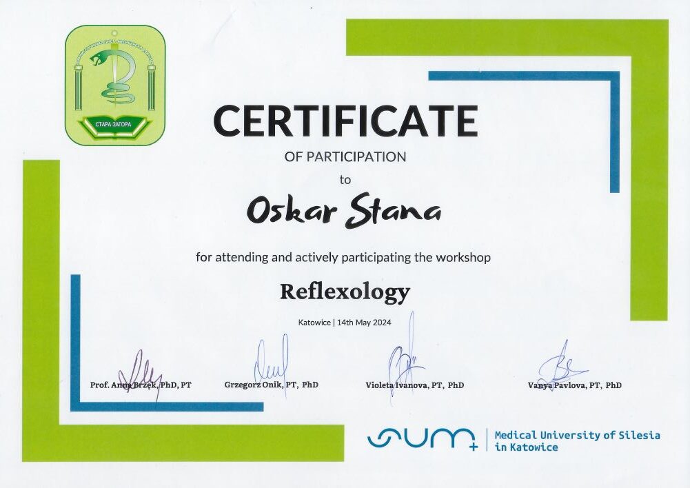 - szkolenie: „Reflexology Katowice, 14.05.2024r – Medical University of Silesia in Katowice