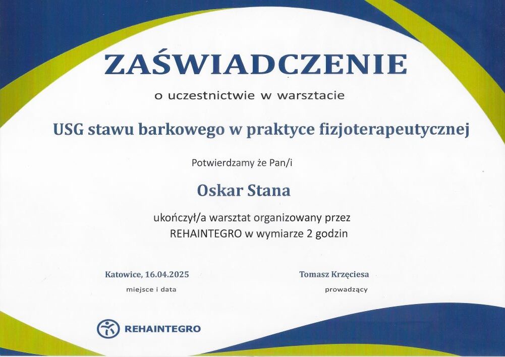 - szkolenie: „USG stawu barkowego w praktyce fizjoterapeutycznej Katowice, 16.04.2025r. – Śląski Uniwersytet Medyczny w Katowicach, REHAINTEGRO, prowadzący: mgr Tomasz Krzęciesa