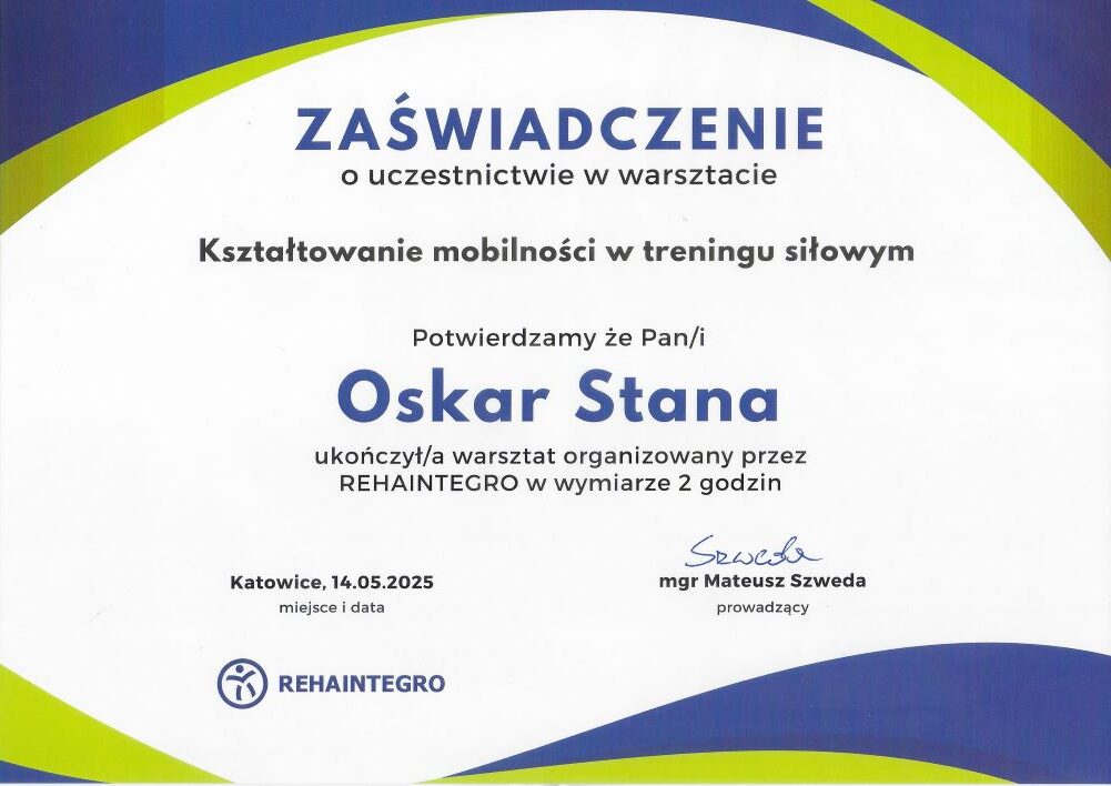 - szkolenie: „Kształtowanie mobilności w treningu siłowym Katowice, 14.05.2025r. – Śląski Uniwersytet Medyczny w Katowicach, REHAINTEGRO, prowadzący: mgr Mateusz Szweda