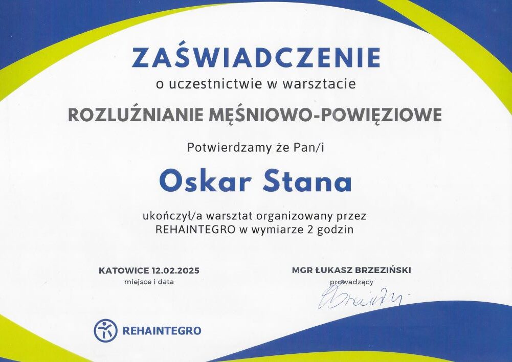 - szkolenie: „Rozluźnianie mięśniowo-powięziowe Katowice, 12.02.2025r. – Śląski Uniwersytet Medyczny w Katowicach, REHAINTEGRO, prowadzący: mgr Łukasz Brzeziński