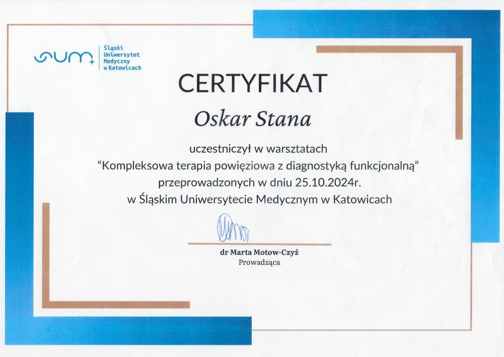 - szkolenie: „Kompleksowa terapia powięziowa z diagnostyką funkcjonalną Katowice, 25.10.2024r. – Śląski Uniwersytet Medyczny w Katowicach