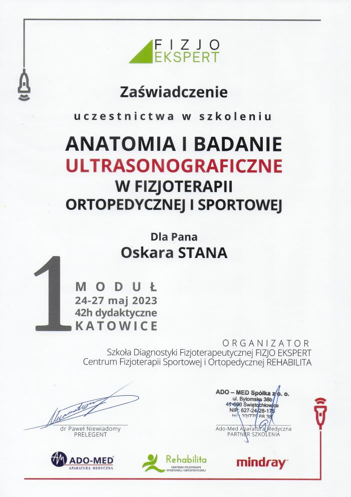 - szkolenie: „Anatomia i Badanie Ultrasonograficzne w Fizjoterapii Ortopedycznej i Sportowej I moduł: 24-27.05.2023, Czas trwania: 42h dydaktyczne, Miejsce: Katowice – Szkoła Diagnostyki Fizjoterapeutycznej FIZJO EKSPERT Centrum Fizjoterapii Sportowej i Ortopedycznej REHABILITA