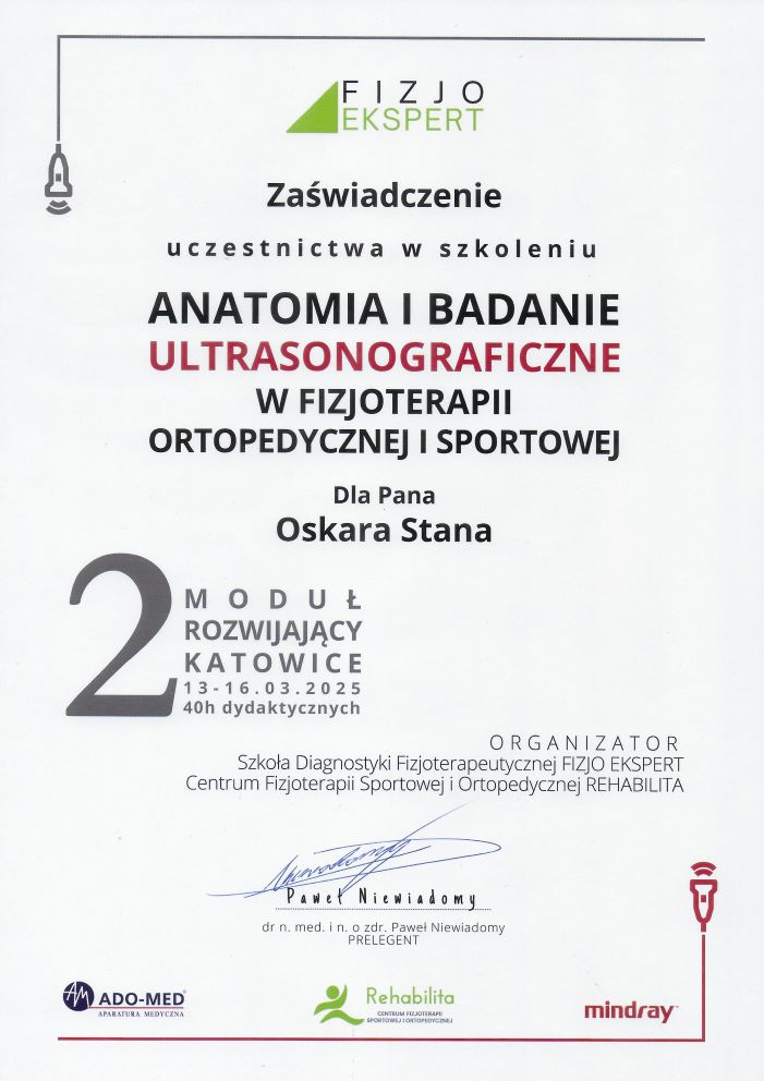 - szkolenie: „Anatomia i Badanie Ultrasonograficzne w Fizjoterapii Ortopedycznej i Sportowej II moduł: 13-16.03.2025, Czas trwania: 40h dydaktycznych, Miejsce: Katowice – Szkoła Diagnostyki Fizjoterapeutycznej FIZJO EKSPERT Centrum Fizjoterapii Sportowej i Ortopedycznej REHABILITA