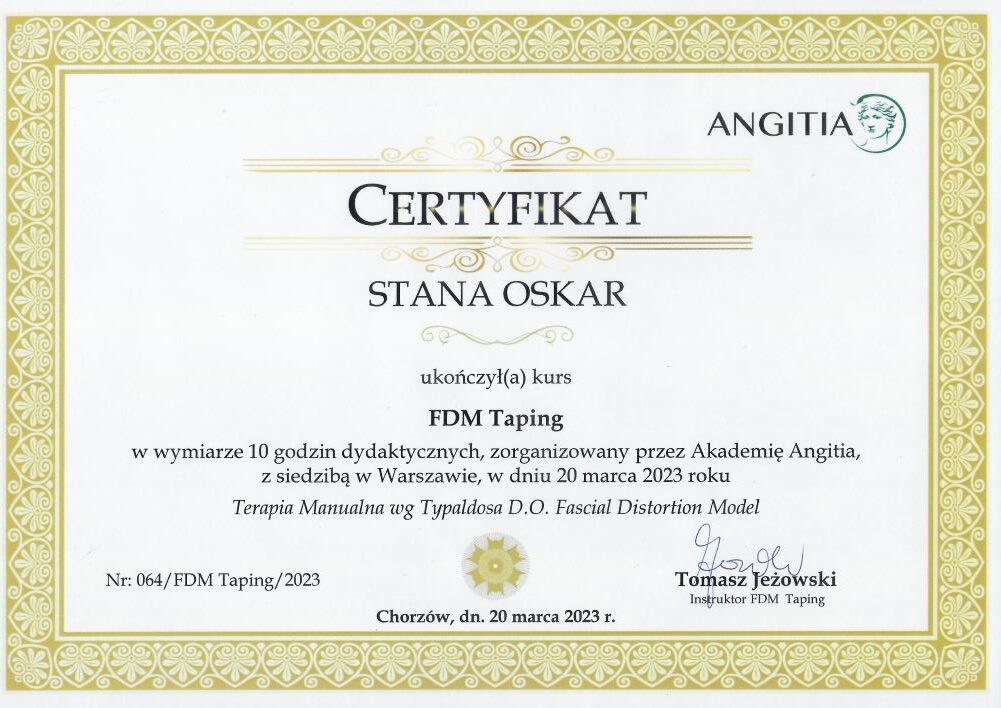 - szkolenie: „FDM Taping – Terapia Manualna wg Typaldosa D.O Fascial Distortion Model Chorzów, 20.03.2023r. – ANGITIA